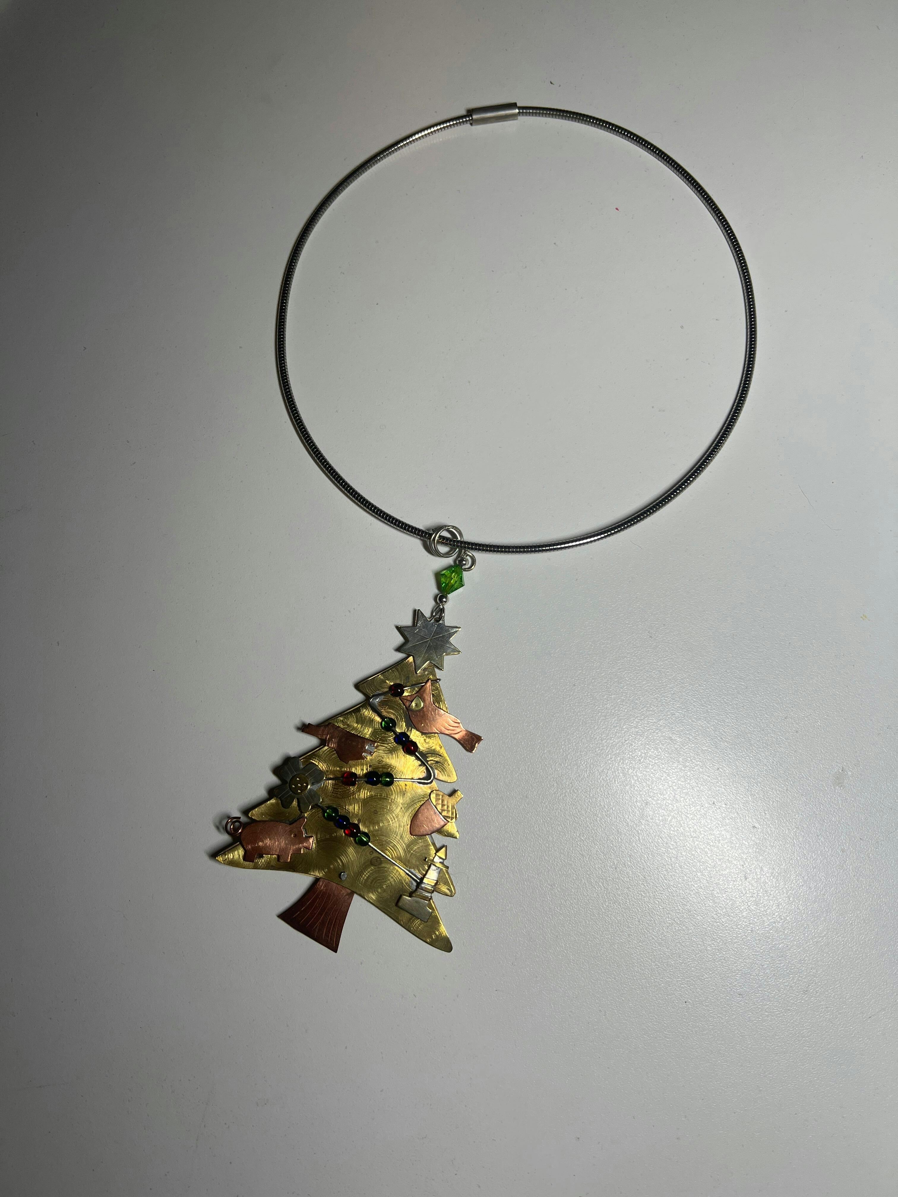 Rock around this North Carolina Christmas tree! This timeless artisan-made ornament features North Carolina holiday symbols -- Moravian star, cardinal, NC state shape, dogwood blossom, acorn, pig, and Cape Hatteras lighthouse -- set in lead-free nickel and brass on a Christmas tree shape with moving trunk.